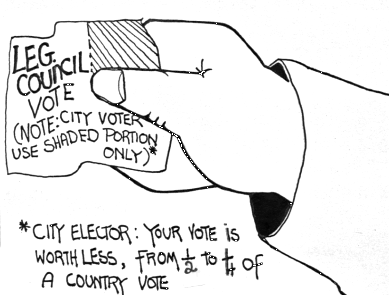 These reforms are by no means comprehensive. In regard to the LA, the Government was constrained by an election promise to preserve five districts in the Mining and Pastoral Region, covering most of the remote areas of the state. In the rules for redistribution of boundaries in some LA districts, square kilometres will be equated with electors, which will produce districts with well below average enrolment, some more than 9,000 electors below [See the tables below]. This means that one vote, one value is not applied in the Mining and Pastoral region. This takes the edge off reform and leaves ground for further reform. The biggest problems are with the Legislative Council (LC), which remains unreformed and undemocratic. The Government was forced to conform to Greens policy regarding the LC, as the Greens made their model of the LC a condition of their support for reform. Consequently, there are serious compromises to principles of democratic representation in Parliament. Firstly, the LC will continue to have extremes of vote weighting of more than 4 : 1 between metropolitan and rural voters. Under the previous system there were 17 MLCs representing 74% of electors in metropolitan regions, and 17 MLCs representing 26% of electors in country regions. It seems unconscionable to ignore such large inequalities, but that is what the new law does by the addition of one MLC to either side of the country/metro allocation to make it 18/18 (six regions, each with six members). This is a serious flaw, and does nothing to address the existing imbalance in representation. The second flaw is no less serious, and has the potential to result in an inaccurate reflection of voters' wishes. In order to win a seat when six are to be elected by proportional representation from a region an MLC must obtain 14.3% of the vote. It will be highly unlikely for a party to win a majority (ie. four out of six members in a region) as they would have to obtain 57.2% of the vote. The problem lies with the even number of seats. Under proportional repsesentation the election of an uneven number of representatives from each region will more accurately reflect the votes cast, a principal which applied under the previous system. Under the system insisted on by the Greens it will be possible for 57% to vote for party A and 43% to vote for party B - a clear decision by voters - and yet each party would win three seats from that region. Thus, winning the vote may not translate into winning the election. [See note below about Senate elections] |