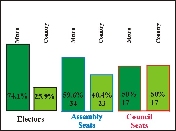 | A tolerance of plus or minus 1.5% is permitted at a redistribution from the average district enrolment in the country and from the average district enrolment in the metropolitan area. The quota of votes to elect a Member to the Legislative Council is 16.7% when 5 are to be elected and 12.5% when 7 are to be elected. | ||||